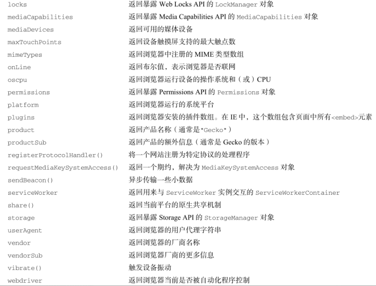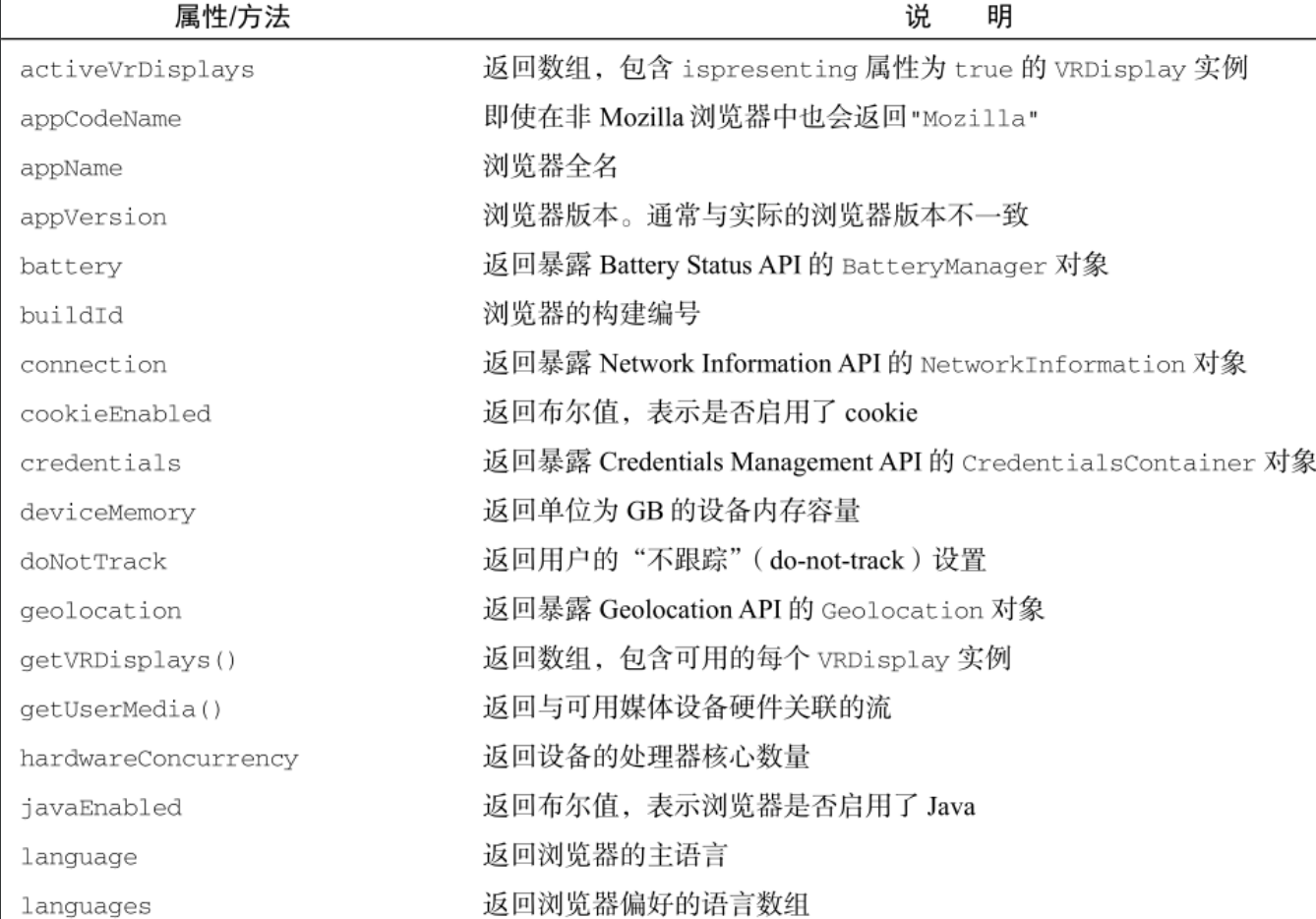 下表列出了 navigator 对象接⼝定义的属性和⽅法: