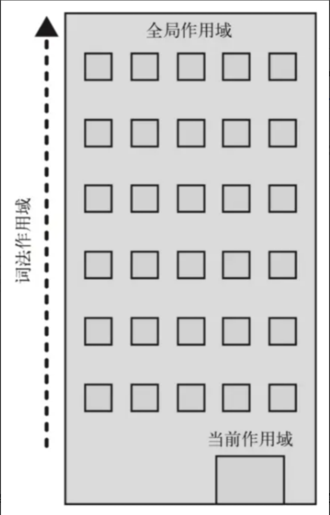 把作⽤域⽐喻成⼀个建筑,这份建筑代表程序中的嵌套作⽤域链,第⼀层代表当前的执⾏作⽤域,顶层代表全局作⽤域